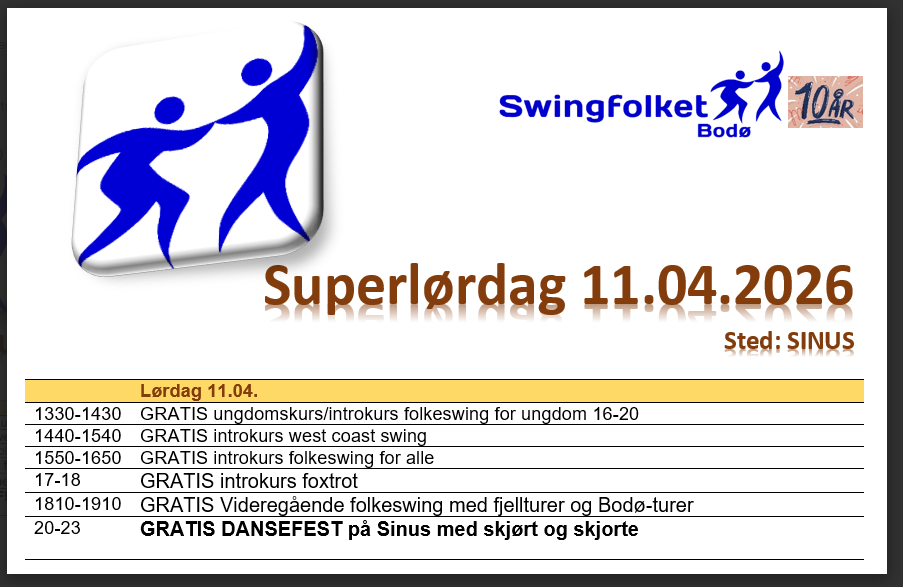 Swingfolket Bodø har 10-års jubileum i 2026! Swingfolket er en lokal klubb med ukentlig aktivitet i form av kurs og dansekvelder.